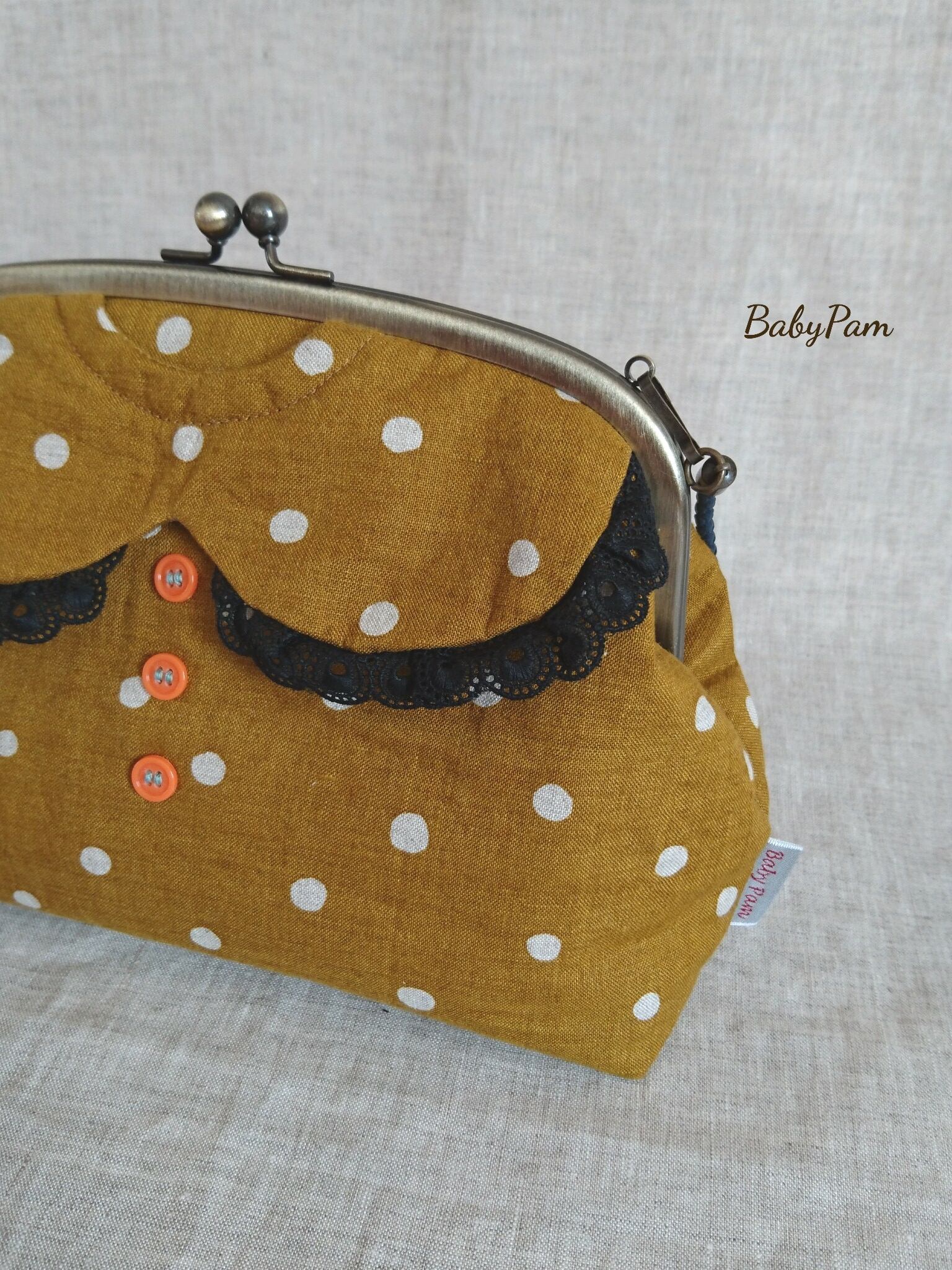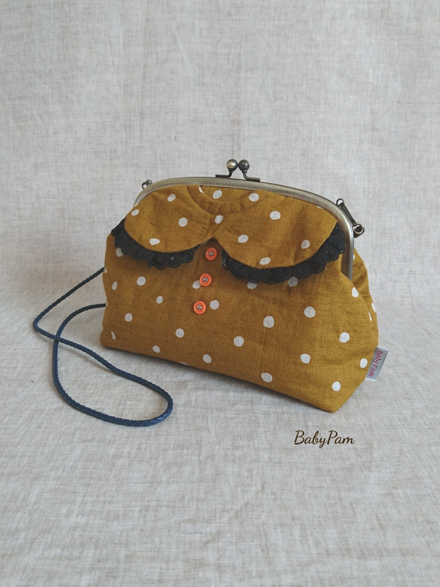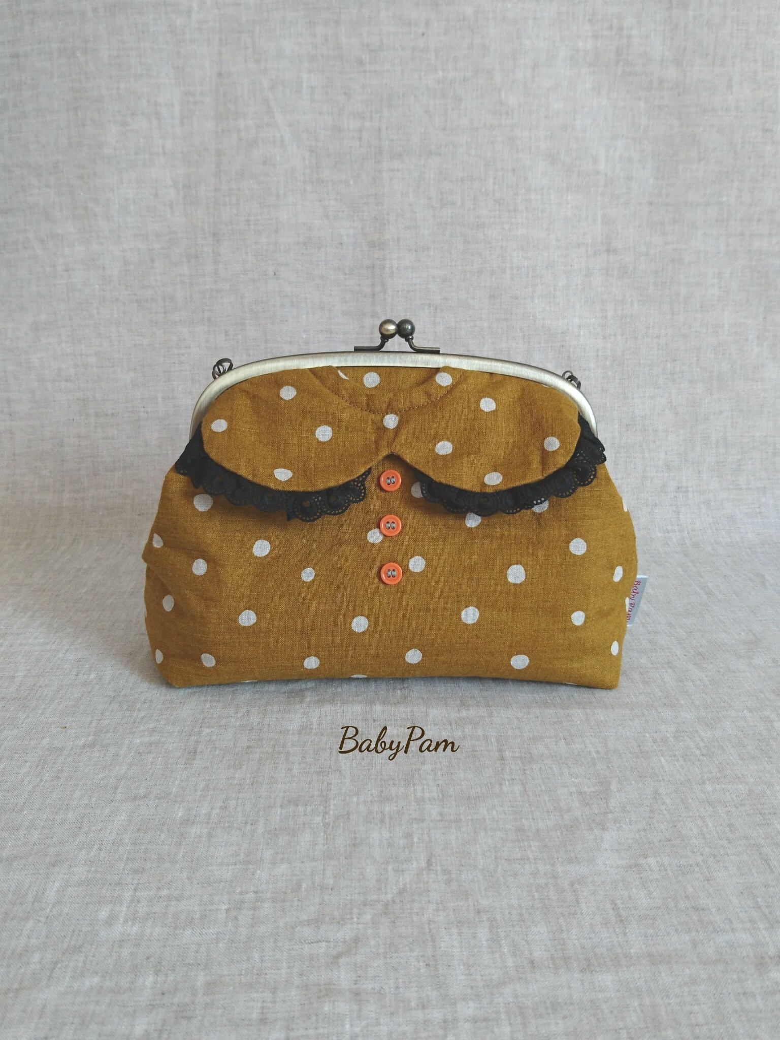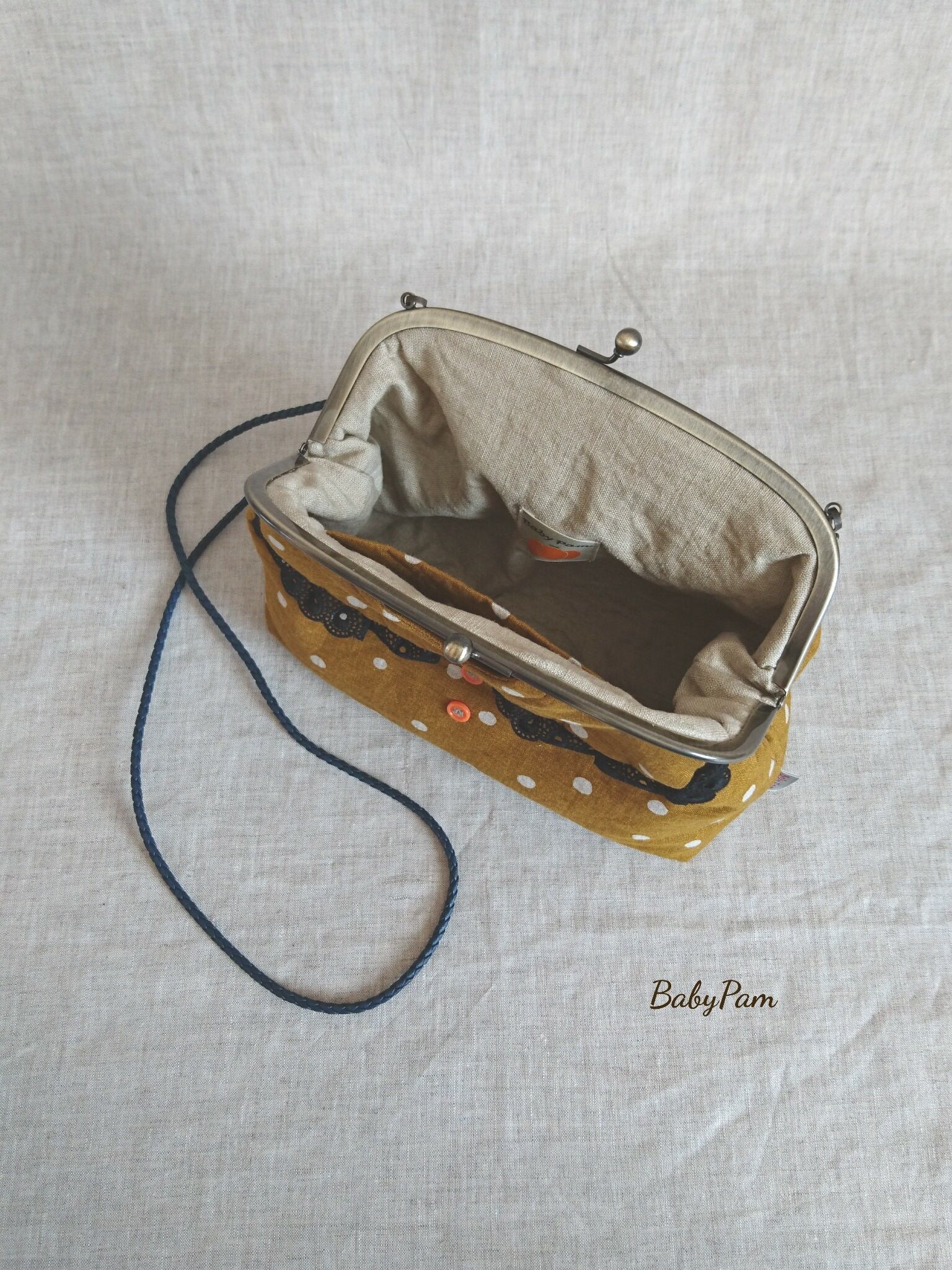 マスタード色に白ドットのリネン生地で作った